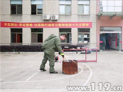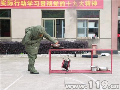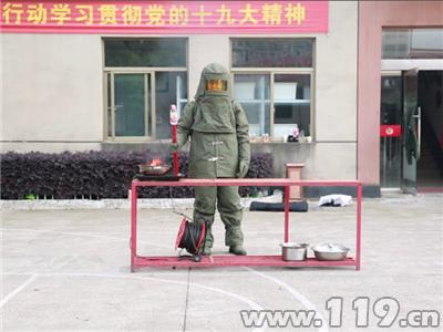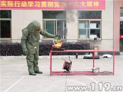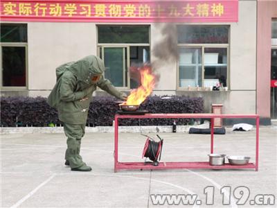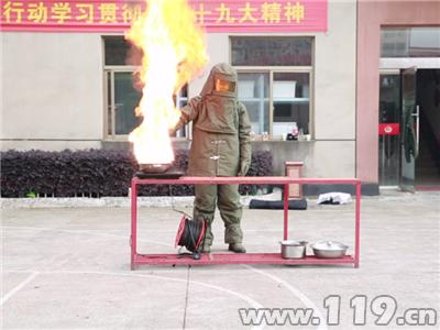 在义乌市消防支队稠江中队的空地上,消防官兵准备了电磁炉、不锈钢锅和食用油,并用电磁炉对锅进行持续加热,待油锅起火后,身穿防护服的消防官兵将水直接倒入油锅中。油遇水的一瞬间,油花四溅,火苗越蹿越高,站在三四米外的人,都能感觉到热浪扑面。